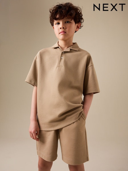 Tan Brown Short Sleeve Textured Polo Shirt and Shorts Set (3-16yrs)