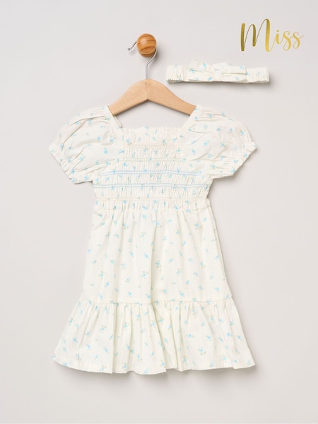 Miss Blue Ditsy Smocked Embroidery Dress With Matching Headband Set