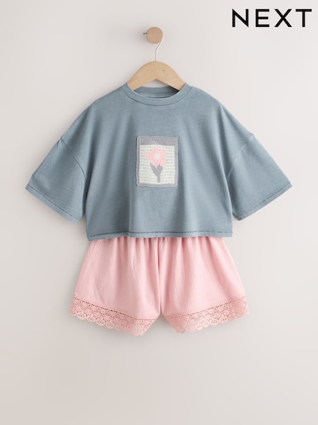 Grey/Pink Flower Detail T-Shirt and Textured Shorts Set (3-16yrs)
