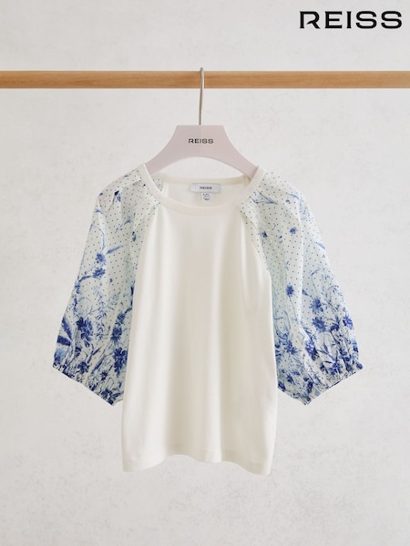 Reiss Blue Print Xanthe 9-13 yrs Cotton Floral Balloon-Sleeve Top