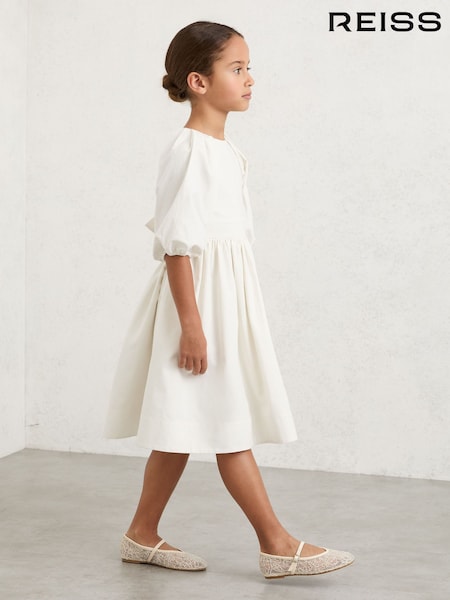 Reiss White Mae 9-13 yrs Puff-Sleeve Tie-Back Midi Dress