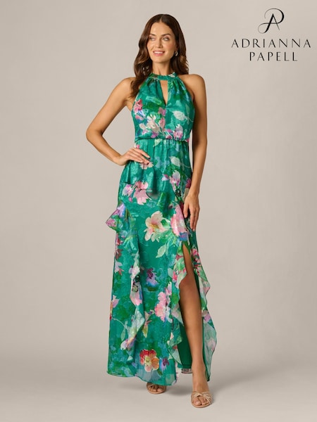 Adrianna Papell Green Printed Mikado Bow Back Gown