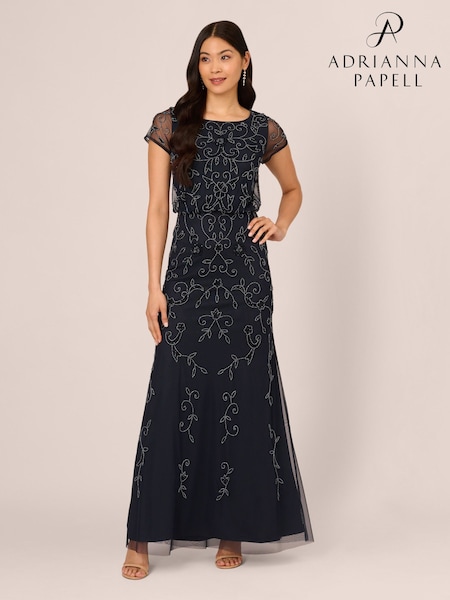 Adrianna Papell Blue Petite Studio Beaded Blouson Long Dress