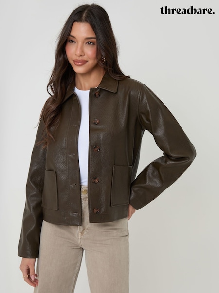 Threadbare Brown Faux Leather Cropped Button Up Jacket