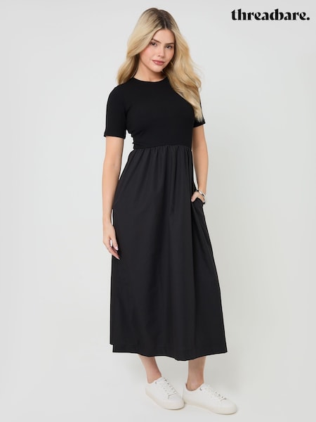 Threadbare Black 2-in-1 Jersey Poplin Mix Crew Neck Midi Dress