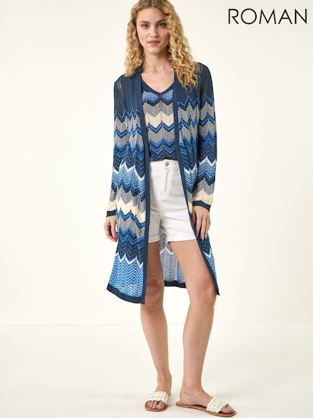 Roman Blue Wave Chevron Longline Knit Cardigan