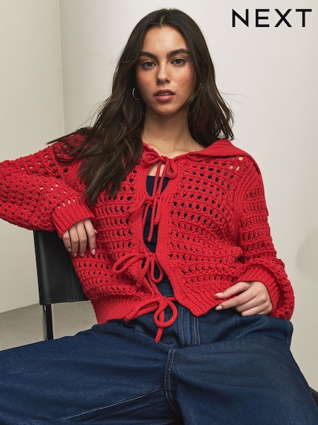 Red Cotton Rich Mesh Tie Front Cardigan