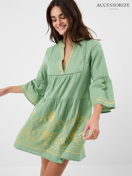 Accessorize Green Embroidered Flute Sleeve Mini Dress