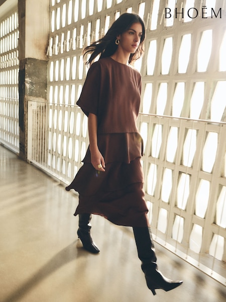 BHOEM Frill Flowy Short Sleeves Midi Brown Dress