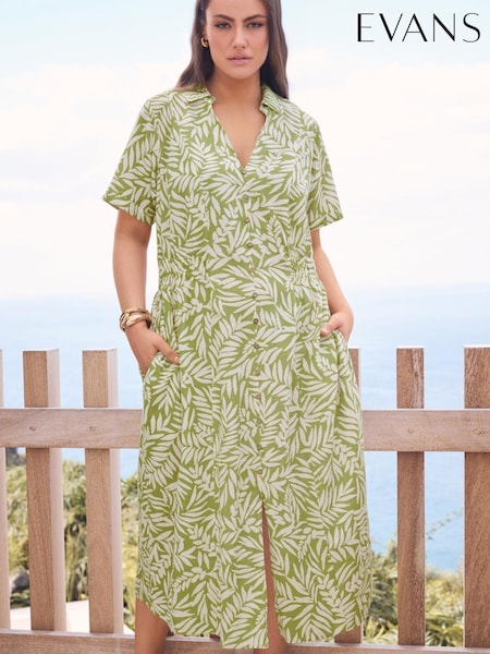 Evans Green Linen Blend Shirred Waist Midi Dress