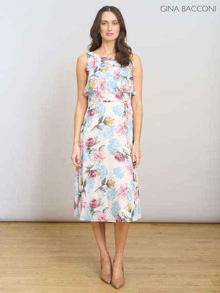Gina Bacconi White Tulisa Sleeveless Floral Midi Dress