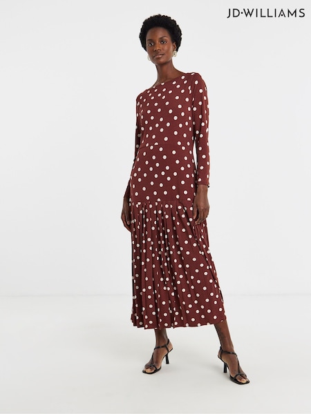 JD Williams Brown Spot Textured Jersey Dropped Waist Pleated Dress