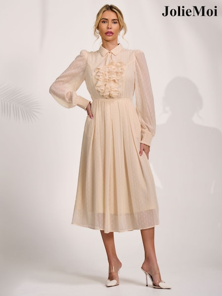 Jolie Moi White Textured Chiffon Long Sleeve Shirt Dress