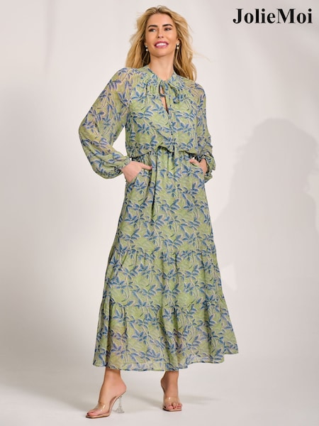 Jolie Moi Green Chiffon Long Sleeve Tiered Maxi Dress