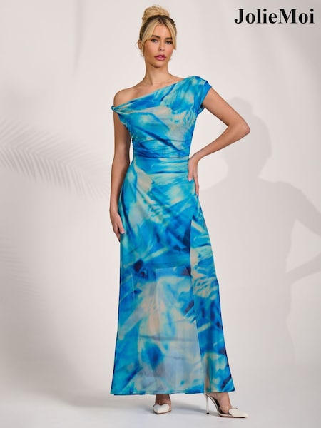 Jolie Moi Blue Mesh Asymmetrical Off-Shoulder Maxi Dress