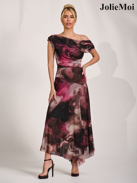 Jolie Moi Pink Asymmetrical Draped Mesh Maxi Dress