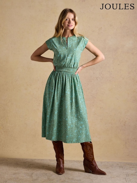 Joules Lilia Green Jersey Smocked Waist Midi Dress