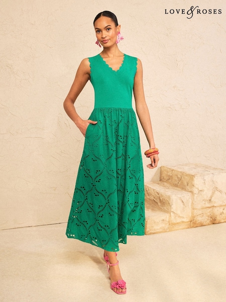 Love & Roses Bright Green V-Neck Broderie Skirt Jersey Midi Dress