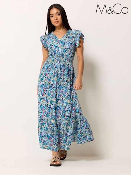 M&Co Blue Ditsy Petite Floral Ruffle Sleeve Maxi Dress