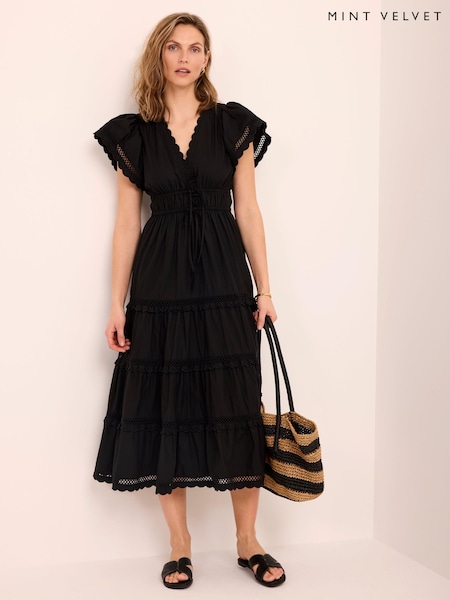 Mint Velvet Black Cotton Scallop Trim Maxi Dress