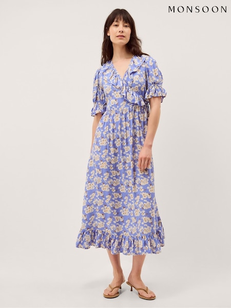 Monsoon Blue Sian Floral Print Ruffle Midi Dress