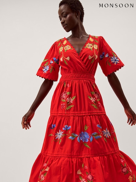 Monsoon Red Emma Floral Embroidered Midi Dress