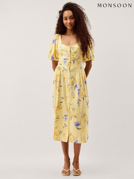 Monsoon Yellow Etta Floral Linen Blend Midi Dress