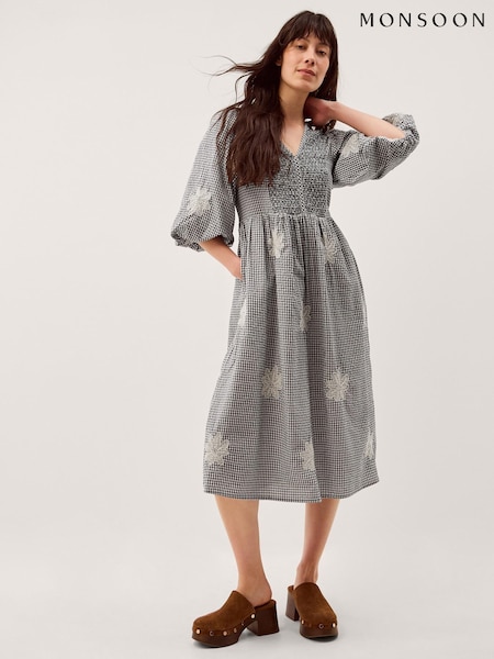 Monsoon Black Mimi Puff Sleeve Gingham Midi Dress