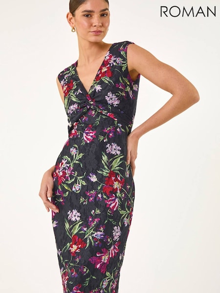 Roman Black Floral Print Tie Waist Midi Dress