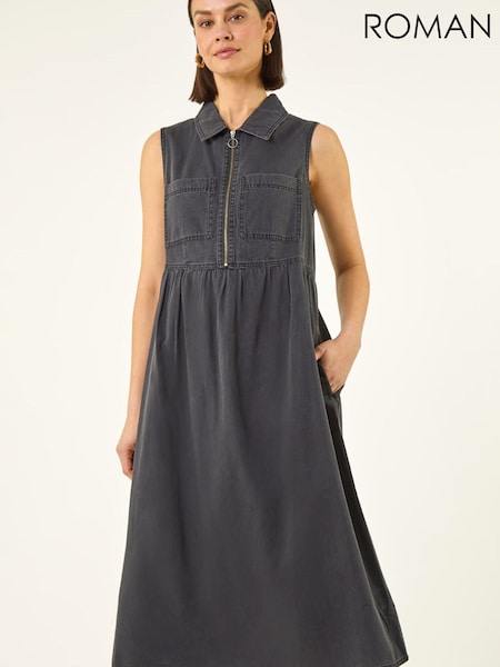 Roman Black Collared Zip Front Midi Dress