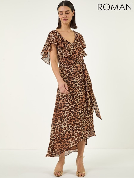 Roman Brown Animal Print Gathered Waist Midi Dress
