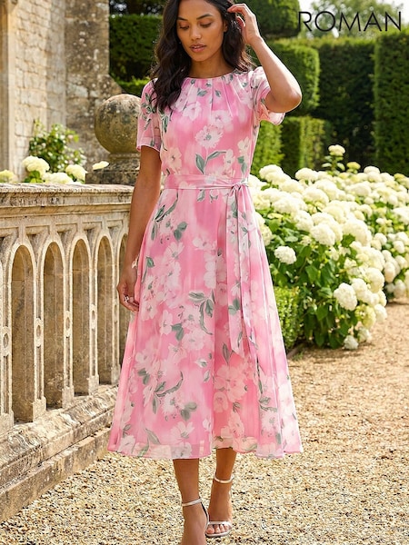 Roman Pink Floral Print Pleat Neck Midi Dress