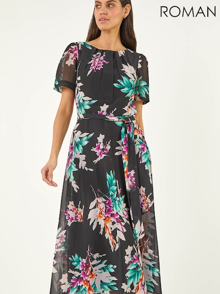Roman Black Floral Print Pleat Neck Midi Dress