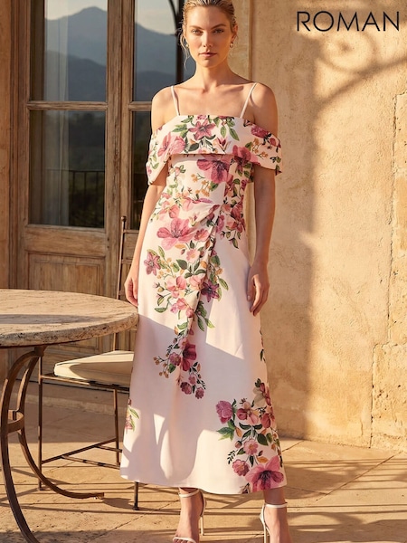 Roman Blue Petite Ditsy Floral Frill Midi Dress