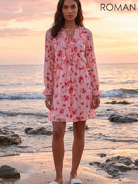 Roman Pink Rose Print Ruffle V-Neck Smock Dress