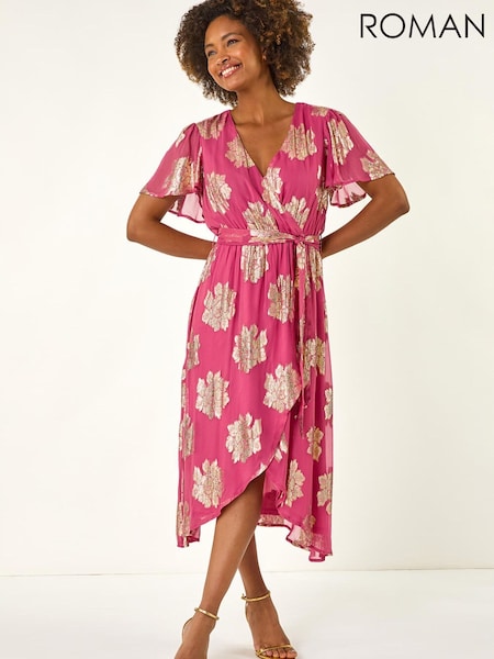 Roman Pink Jacquard Midi Wrap Dress