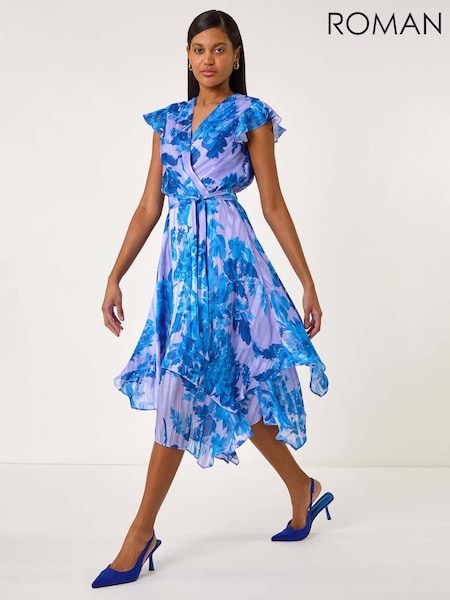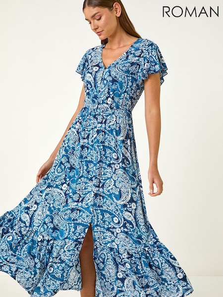 Roman Blue Paisley Print Crinkle Maxi Dress