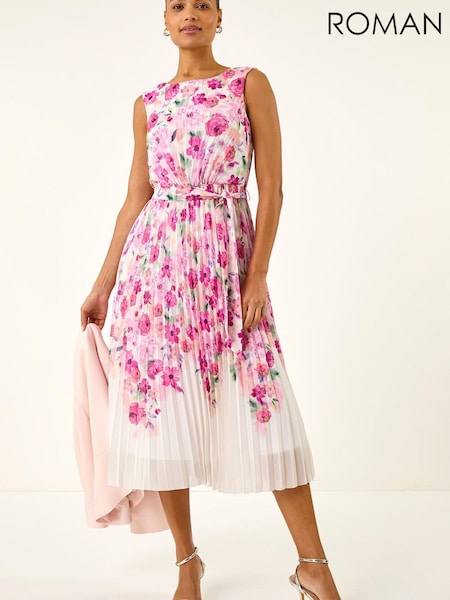 Roman White Floral Pleated Midi Dress