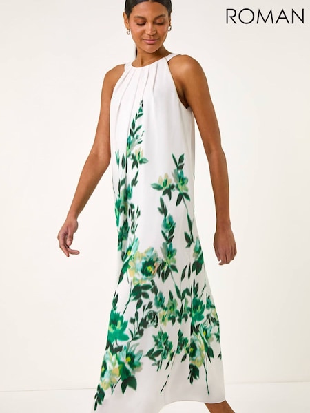 Roman Green Floral Print Halter Neck Midi Dress