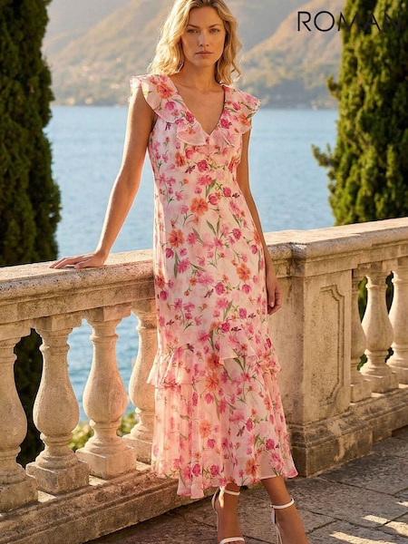 Roman White Floral Frill Chiffon Midi Dress