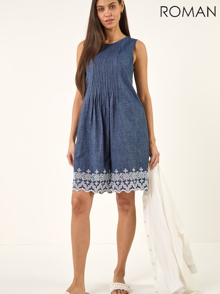Roman Blue Embroidery Hem Smock Dress