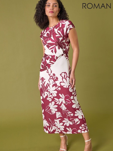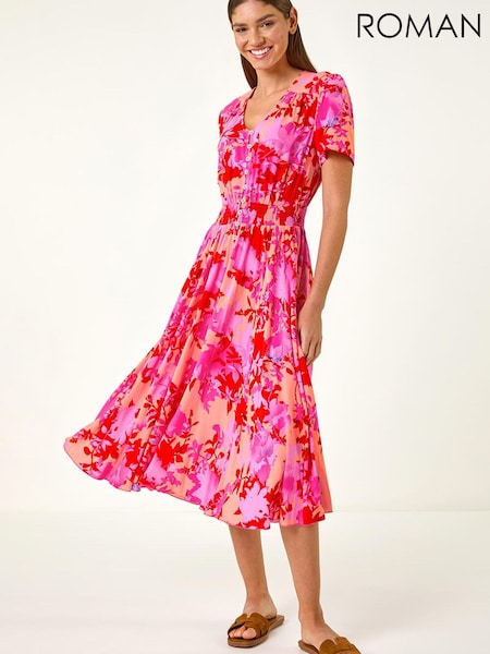 Roman Pink Shadow Floral Print Shirred Midi Dress