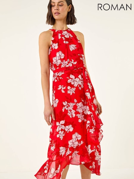 Roman Red Floral Print Frill Wrap Midi Dress