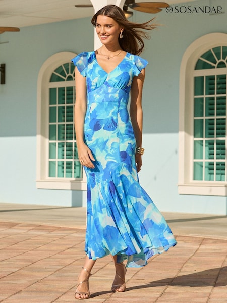 Sosandar Blue Floral Print Chiffon Angel Sleeve Dress
