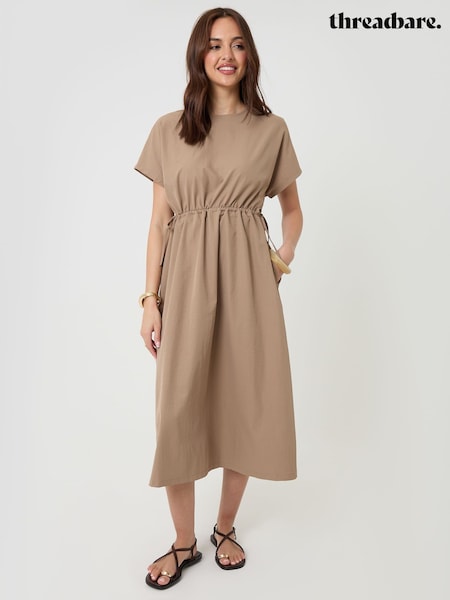 Threadbare Brown Elasticated Waist Cotton Poplin Midi Dress