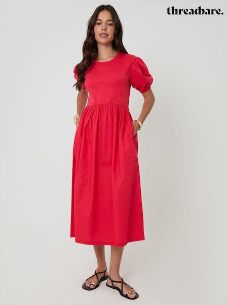 Threadbare Red Puff Sleeve Jersey Poplin Mix Maxi Dress