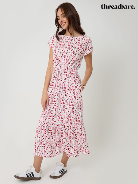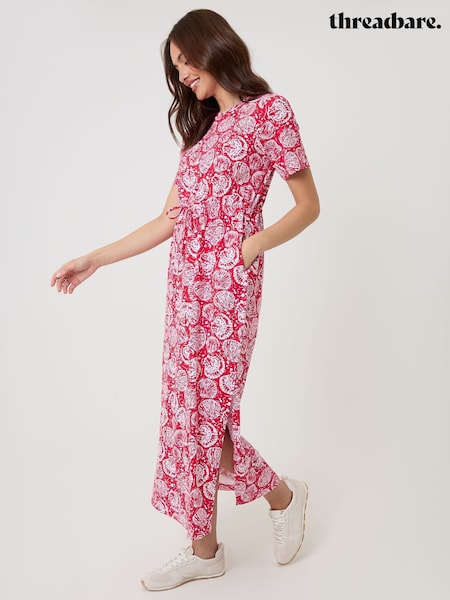 Threadbare Red Drawstring Waist Side Split Cotton Jersey Midi Dress