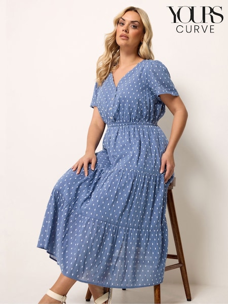 Yours Curve Blue Notch Neck Tiered Swissdot Dress