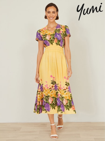 Yumi Yellow Floral Mirror Print Viscose Midi Dress