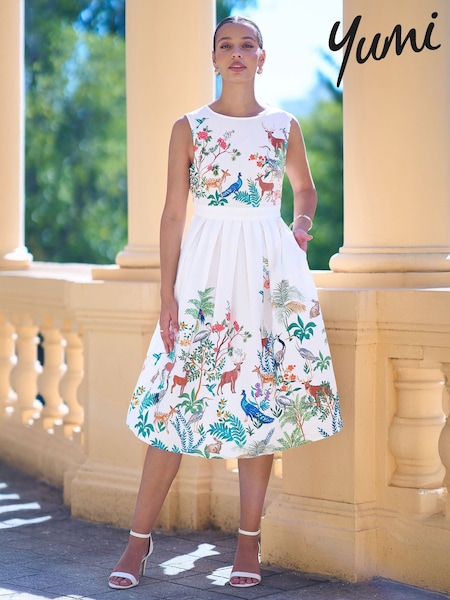 Yumi White Woodland Animal Print Cotton Midi Skater Dress